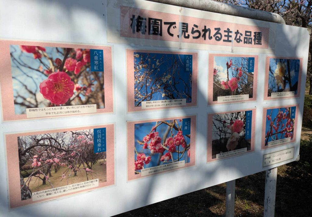 下の写真の通り一つの木に白い梅やピンク色の梅など、名前のとおり各花が思い思いの色で咲いていてとても不思議な感じでした。