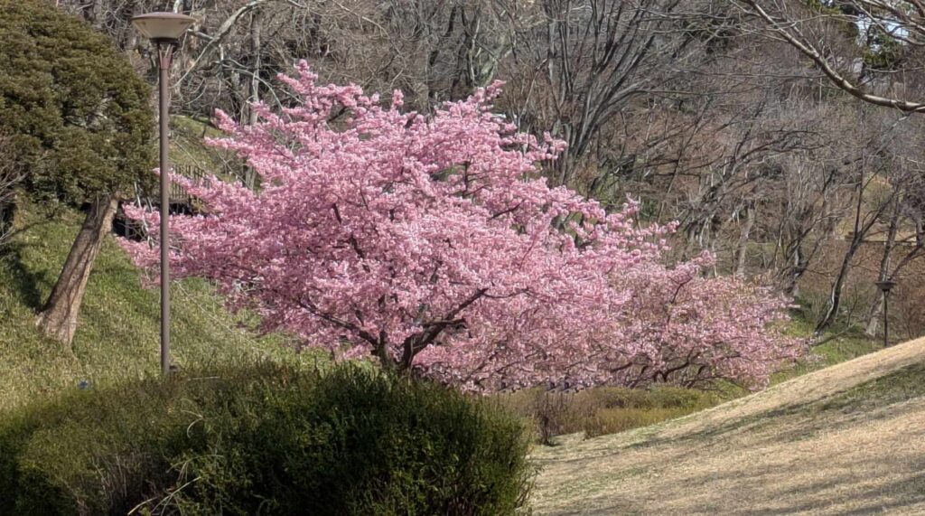 なお、梅園から1つ坂を降りたところは小川が流れる公園になっており、そこでラッキーにも河津桜もみることができました。