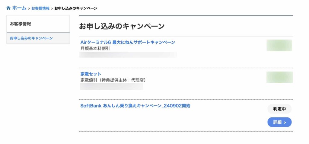 すると現在適用済み、もしくは申請可能なキャンペーンが表示されるので、その中から「あんしん乗り換えキャンペーン」を選択します。