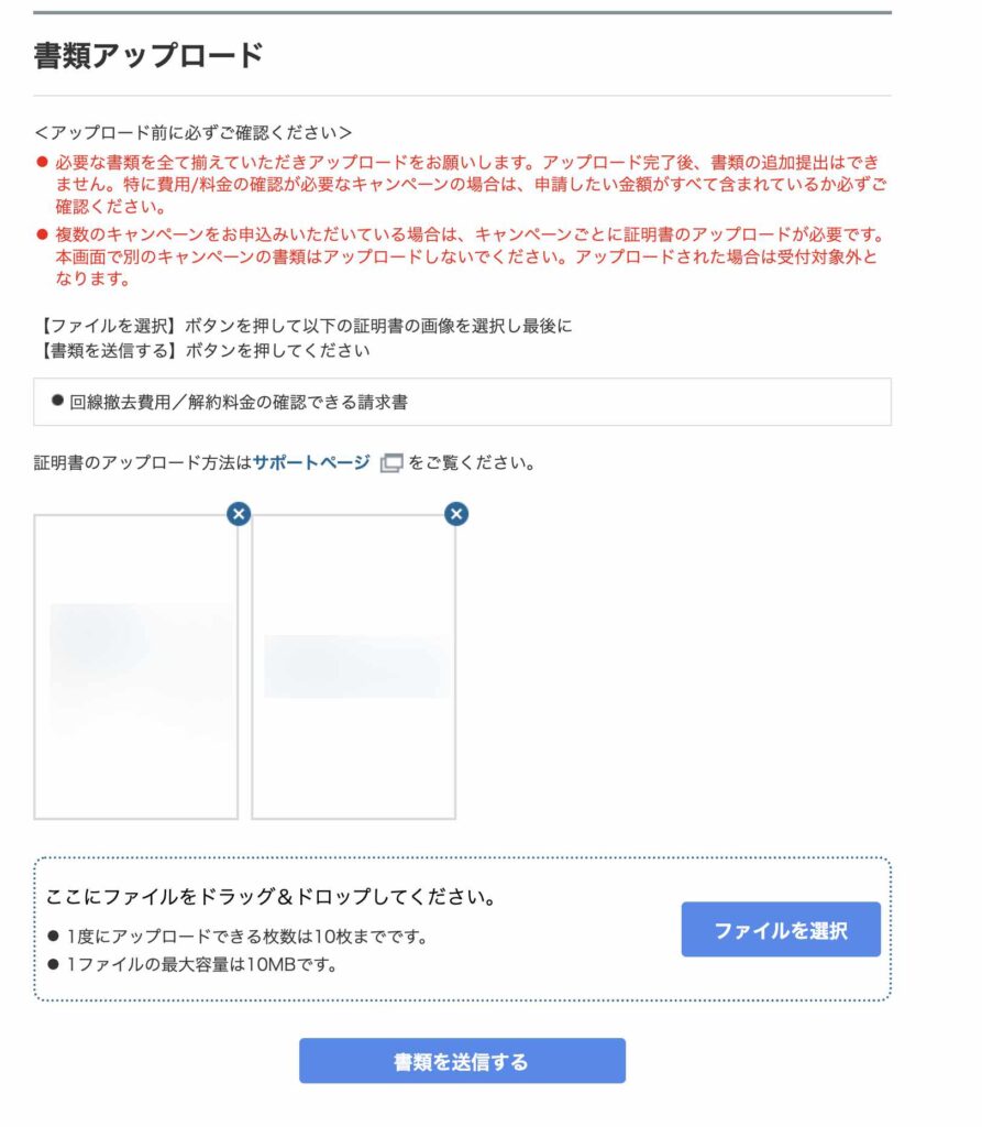 「あんしん乗り換えキャンペーン」のページが表示されたらMIMAXの契約解除料や自分の名前が入った資料をアップロードし送信します。