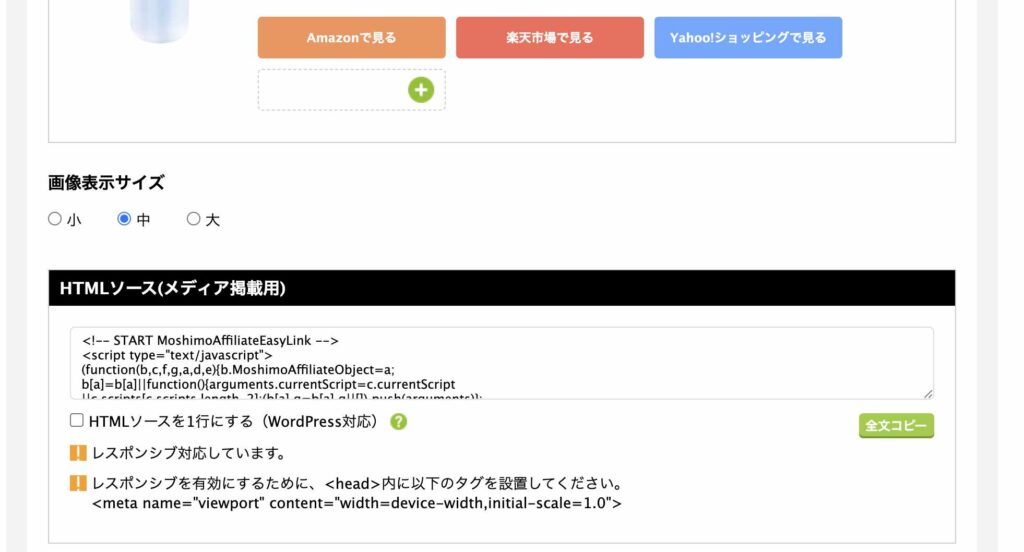 次に、「もしもアフィリエイト」で広告のHTMLソースを作成したら、「全文コピー」ボタンでコピーしておきます