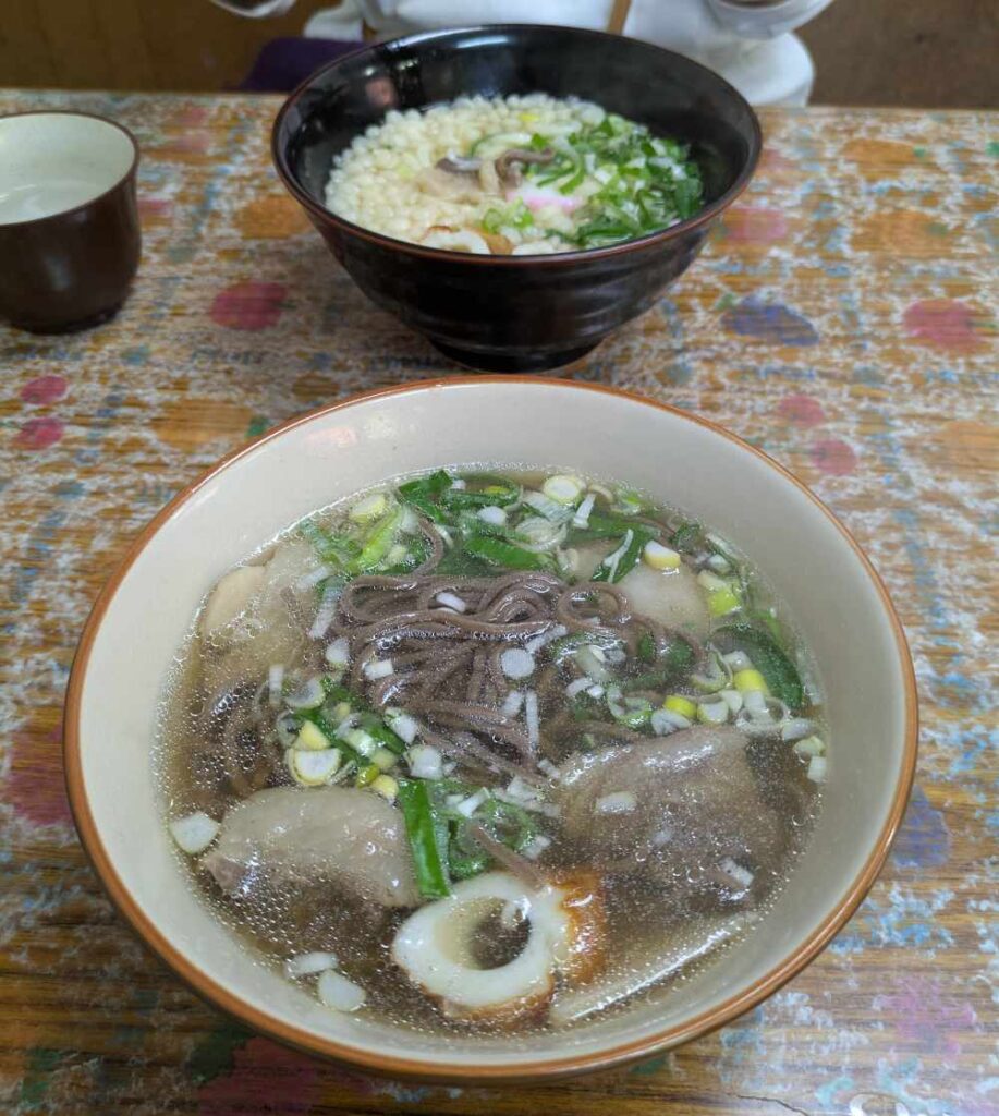 そしてこの建物の一番奥にあるうどん・そばのお店「カタマタ」で注文した「しし肉そば」と「かやくうどん」がこちらです。