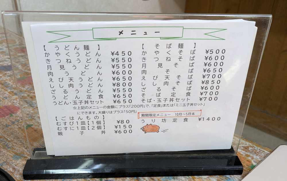 ほかにもいくつかメニューがあるようですが、「うり坊定食」は気になりますね。また、うどんやそばにプラス200円で「ミニたまご丼セット」にできるのはお得な感じがします。