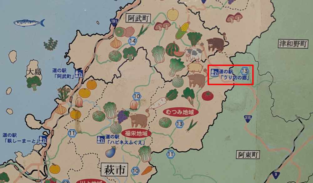 道の駅「うり坊の郷」の場所は下図の赤枠のあたりです。9号線から315号線に入り、阿東町を通過すると見えてきます。道沿にあるので見逃すことはないと思います。