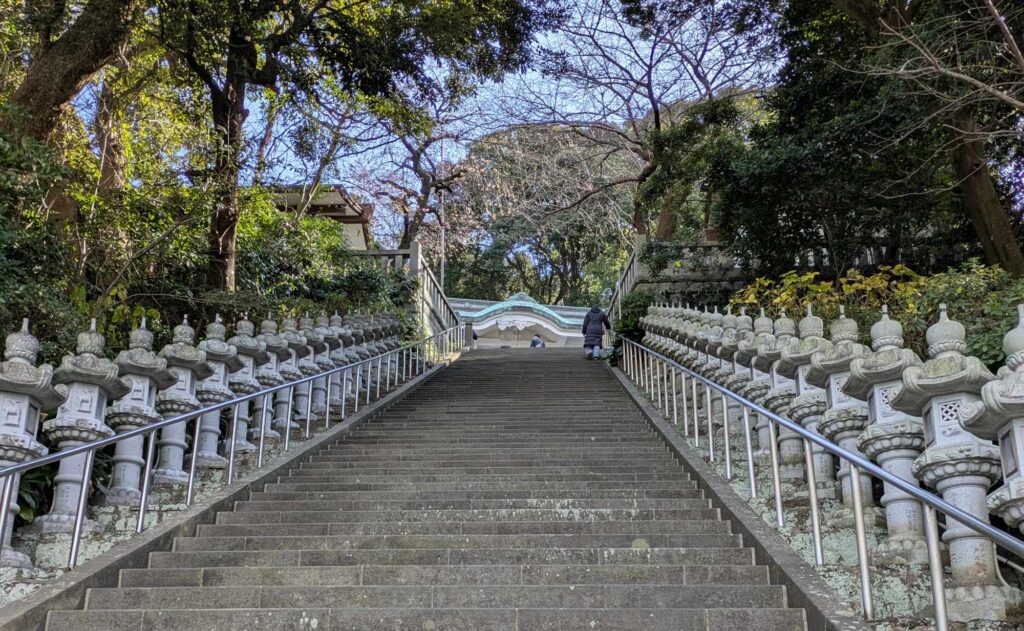 次は真鶴といえばこの神社というところに行き、2つめのスタンプをゲットしました。ここの神社には石段の下に10台くらい車を停められる駐車場があり助かりましたが、ほぼ満車状態でした。